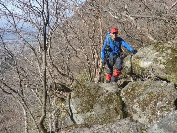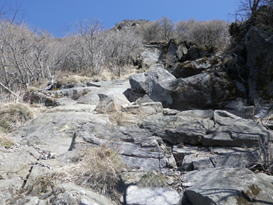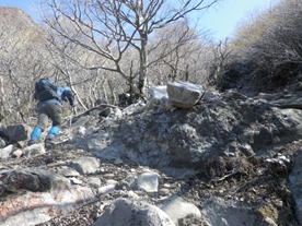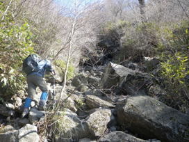 根っこで岩を包む大木 8時29分 森の主か? 今にでも動きそうな白くて大きな木だった。ん?木が何やら話しかけてくる・・・。 「自然を大切に!」と聞こえたような・・・。 ![]() 森を抜け涸れ沢に出たが、右に渡って大きな岩が続く急坂を上って行く。一つ一つ岩をクリアしていくのが楽しい上りだった。 8時44分 |