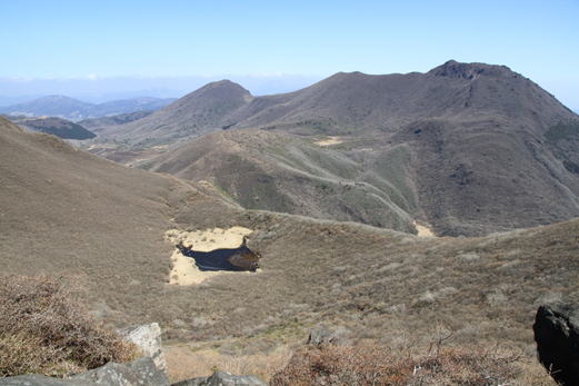 左眼下に片ヶ池、その後ろに立中山、奥は左から平治岳、北大船山、大船山の峰々 11時02分