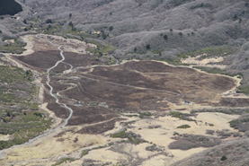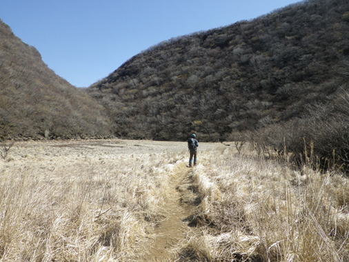 坊ヶつるを見下ろすと、3月27日(5日前)に野焼きがあったらしく、焦げて黒くなっていた。