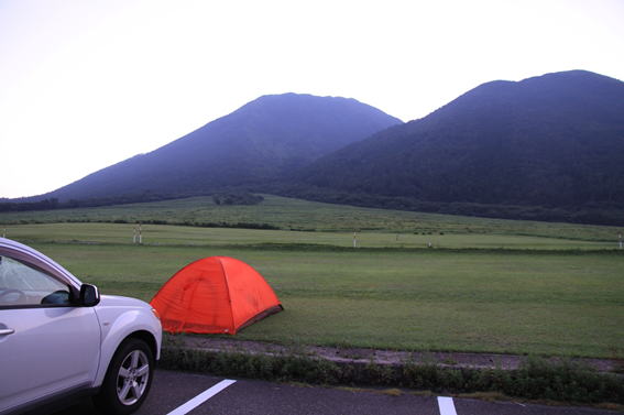 | 西の原駐車場で野営 5時00分起床 グリーンの芝生を一坪お借りして一夜を過ごした 夜中、テントから出てみると満点の星空に三日月が輝いていた。 左の山が本日挑戦する「男三瓶山」 |