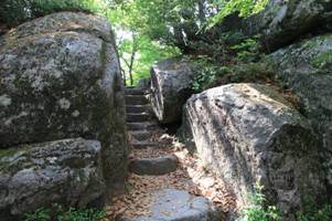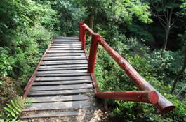 岩道を黙々と下っていくと木の橋が・・・。 |