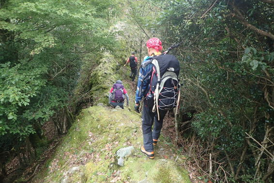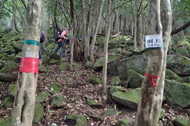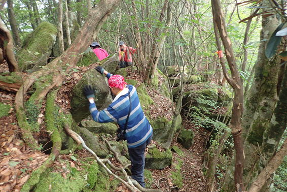 声掛け合って 12時03分 段差の大きい岩場を慎重に下りていく |