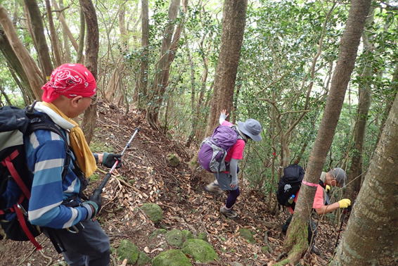 | 急登は更に傾斜がきつくなる 8時38分 積もった落葉が滑ってとても歩き難い 頂上までたった400メートのはずなのに、なかなか前に進まない |