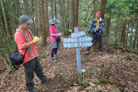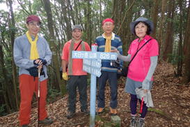 山頂碑の横で記念撮影 9時07分 左からヤジさん、H師匠、T宮さん |