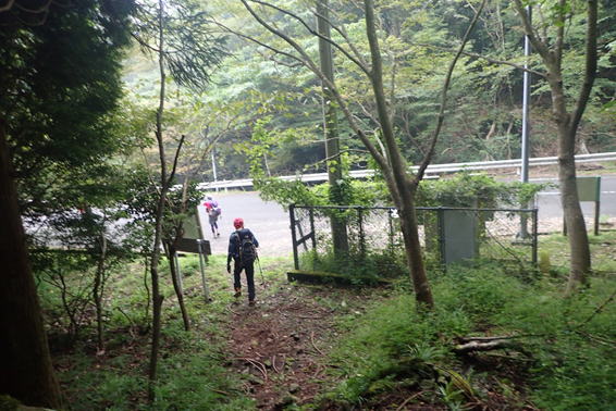 | 我々はこの分岐から右に下って斫石峠(トンネル)の登山口を目指す。 登山口まであと100m下るだけだ。最後まで慎重に! |