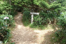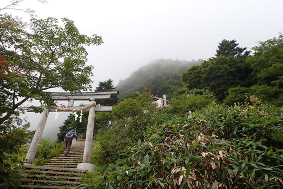 鳥居の下で休憩 12時04分 あいにく山頂方面は霧に包まれている |