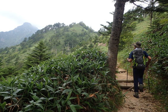 左奥に石鎚山、その手前の小高いピークは鶴ノ子ノ頭だろうか? 少し斜度が増してきたぞ! |