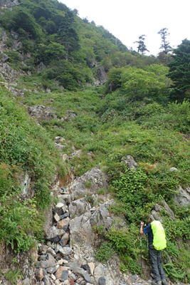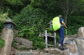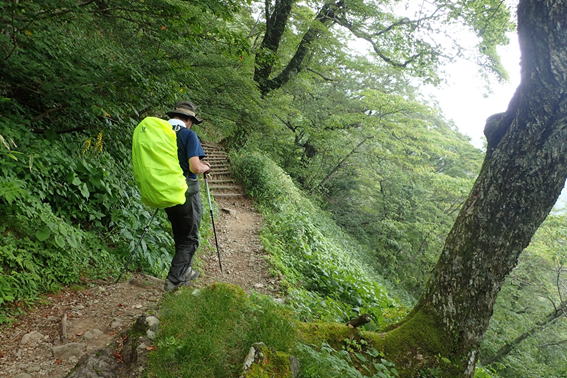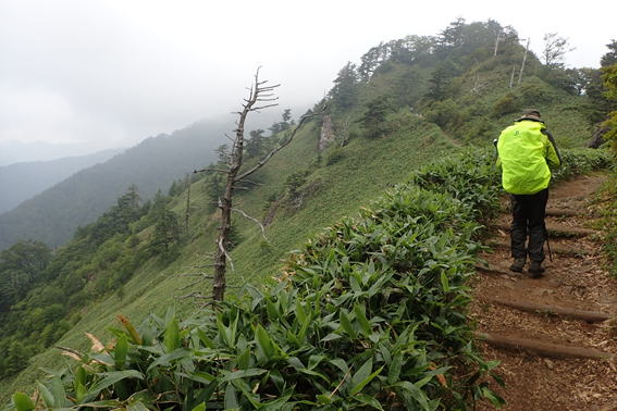 霧に煙る登山道 11時15分 雨は止み上着を脱いだが蒸し暑さは続く |