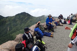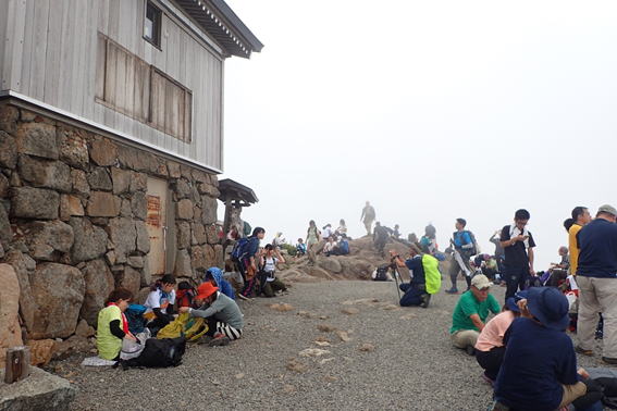 山頂には大勢の登山客 12時44分 おっと、T師匠は登山レディーを写真撮影中。 |