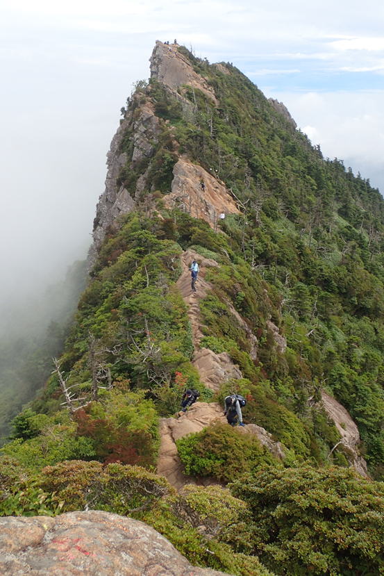 石鎚山・天狗岳への痩せ尾根 13時33分 霧の晴れ間に行ってみようかと思ったが・・・断念 |