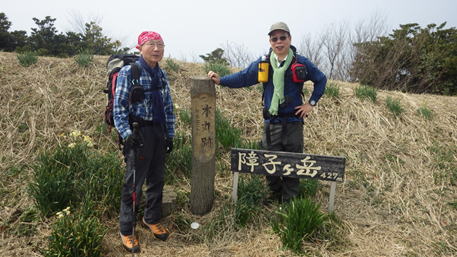 障子ヶ岳山頂 山頂には白や黄色の水仙が咲いていた。