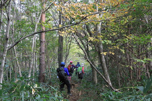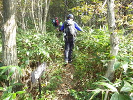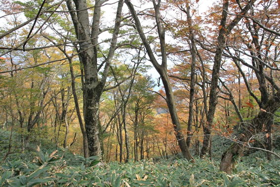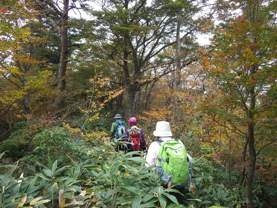 紅葉する高岳山の稜線歩き 背丈近くまで伸びたクマザサが茂る登山道