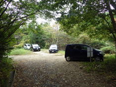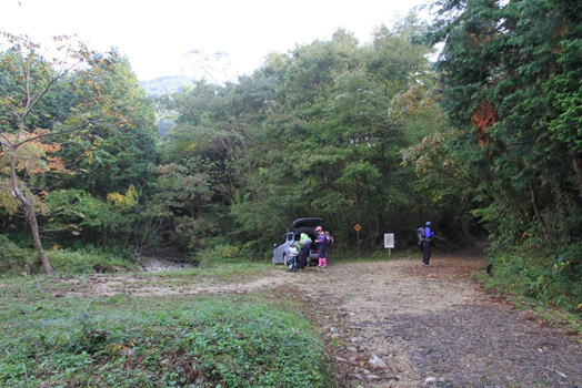 林道途中のスペースに駐車して準備に取り掛かる 8時30分 我々の車だけだ!