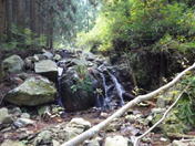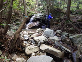 2の沢 9時30分 大小の岩がゴロゴロとして歩き難い。右上に小さな滝があるが水量は少ない。 小さな滝 |