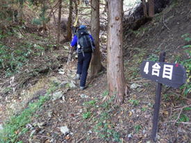 これまでの林道歩きはウォーミングアップ。いよいよ登山口の標識の裏側から取り付く。