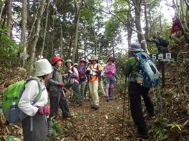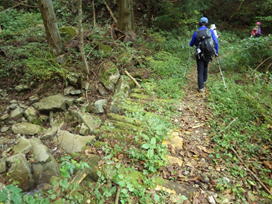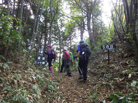 3合目通過 9時47分 T井さんは先頭に立ち、シダの茂る登山道をペースよく上って行く。他の皆さんも遅れることなくしっかりとしたステップを踏む。 順調、順調 |