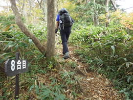 秋の登山道 11時54分 クマザサと紅葉の中、快調に下る