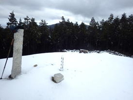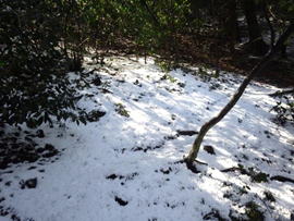 4、建郷山分岐に戻った 12時31分 建郷山の山頂から本道(田床峠)に下る別ルートがあるので、いくつか赤テープに沿って下ってみたが、山は雪に覆われ道がわからない。途中から、続いているはずの赤テープを見つけることが出来ずに引き返した。ちょっと残念だったが、アイゼン(簡易)をしていてもズルズルと滑る急な斜面に苦労していたので、ルートを探るのを早目に断念した。 |