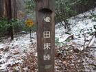 田床峠の道標 12時37分 この角度から見るとわかり難いが、この道標の裏に建郷山への分岐表示が付いている。先程断念したコースはここに続いているはずだ! 次回に挑戦 |