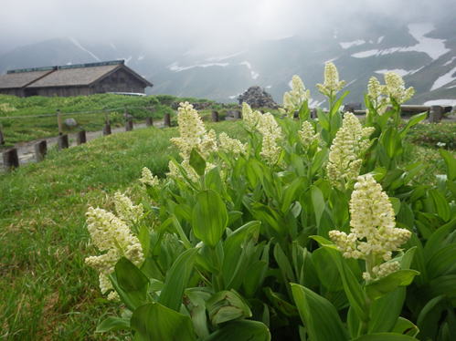 室堂平に咲く コバイケイソウ (左奥に見えるのは日本最古の山小屋)
