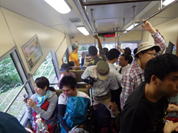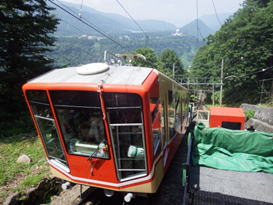 13、美女平から立山ケーブルカー 10時52分 45分程バスに揺られて美女平に到着した。慌ただしくケーブルカーに乗り継いだ。 下界に下るにつれお天気が良くなってきた。 高度が下がると気温もかなり上昇して、半袖でも汗が出てくる。 今までは高所の天然クーラーの中にいた訳だが、ケーブルを降りるといつもの真夏の状態だった。 |