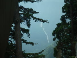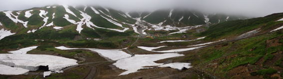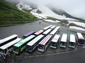 称名滝 7時02分 天空ロードの途中、滝見台(標高1280m)から日本一の落差350mを誇る大瀑布「称名滝」を拝むjことが出来た。 バスは弥陀ヶ原そして天狗原を進む。晴れていれば絶景が目に飛び込んでくるはずだが・・・ 高度を上げるにつれて霧も深くなり、これからの登山意欲が半減してしまう。 そして約45分の乗車を終え室堂に到着した。 |