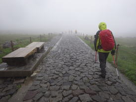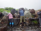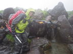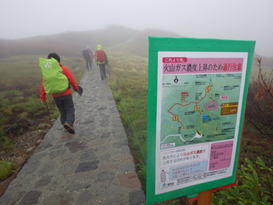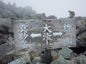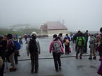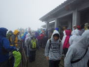 雷鳴は轟き視界は不良 13時23分 雨、霧、雲、そして雷まで・・・。さっきまでのお天気はいったいどこへ行ったのだろう? 雷鳴轟く中、必死に下った。雨で登山道はとても滑りやすくなっている。 団体登山者の渋滞に巻き込まれ、なかなか前に進まない。子供たちも悪条件の中、我慢して歩いている。とにかく滑って転ばないように注意して下山した。 |