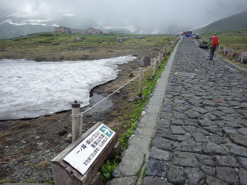 一の越・雄山(立山)の標識に沿って石畳を進む 8時12分 左は雪渓が残っている