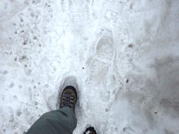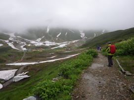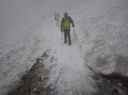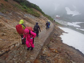 雪渓との格闘 14時38分 雨が降ったので雪渓がとてもよく滑る。皆さん重心を下げて慎重に歩いている。 そろりそろり |