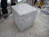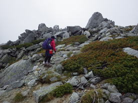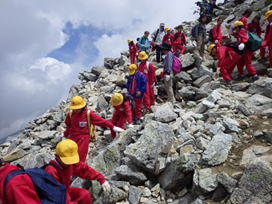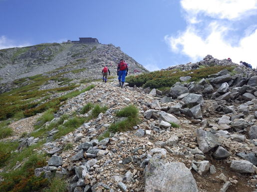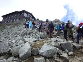山頂はもうすぐ 10時39分 相変わらず渋滞は続いている。あと少しで頂上とういう場所で、渋滞を我慢できずに列を離れて上る人も出てきた。しかし、登山道を離れて他の登山者を追い抜く際、焦って歩くのでつい足に力が入り、時々上から石を蹴って落としている。注意して見ていると、勢いのついた直径20センチ程の石が私の方に落ちてきた。 これは危なかった!焦る気持ちは分るが・・・。 |