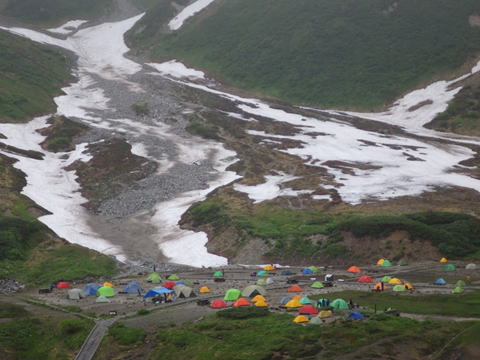 朝食後、ヒュッテのベランダから雷鳥沢キャンプ場方面を眺める 5時56分 雪渓が美しい