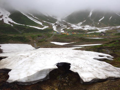 雪渓が解けて下の方が空洞になっている 6時46分 雷鳥沢キャンプ場のテントが見える