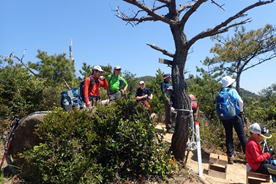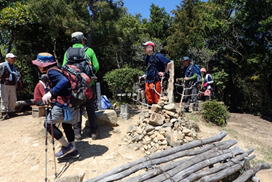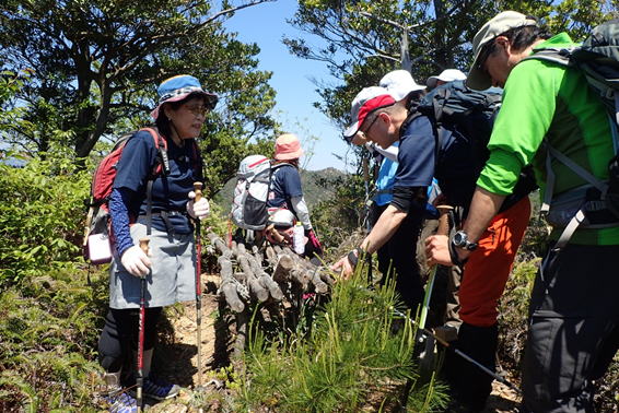 | 8、勘十郎岳・西峰(主峰) 13時44分 246m 全員笑顔で記念撮影(写真提供:Y川さん) |