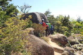 東峰から西峰へ 13時30分 「さあ次に行きましょう!」と、最後のピーク西峰へと向かう。 添い寝岩 |