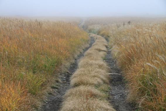 坊ヶツルの真ん中。この先、大船山への登山道へ続く。風に吹かれ、霧に溶け込んで歩いた。