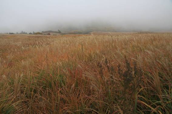 | 天気予報は「晴れ」だったが・・、現地に到着したら濃霧と小雨。 半ば、本日の登山を諦めて、長者原まで様子を伺いに行ってみた。 すると、個人や団体の登山客が、しかも私より年輩の方々がガンガン出発していたので、これは負けてはならないと、 変なスイッチが入ってしまい・・・・・、当初の計画通り、吉部(よしぶ)の登山口に向かった。 残念ながら終日、霧は晴れなかったが、それなりに秋の久住を満喫できた。モミジの「赤」が素晴らしかった。 |