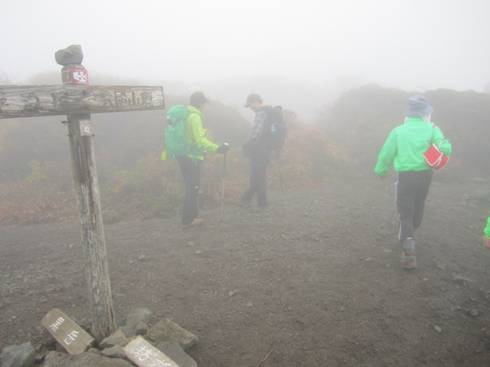 坊ヶツルへの分岐 10時38分 霧の中でもわかりやすい表示がしてある。