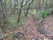 まだ先があった 16時06分 先ほどの分岐に戻り、よく見ると、林道を横切る道が続いていた。木に赤テープがあった。