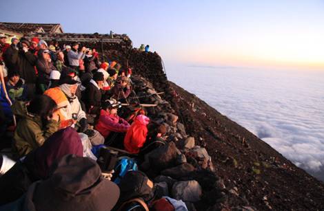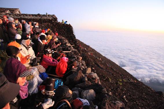 雲海の上の富士山頂にて御来光を待つ登山者。下からはまだ続々と登ってきている。