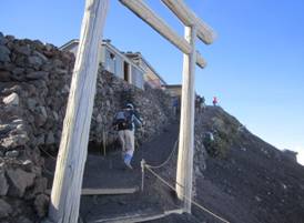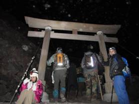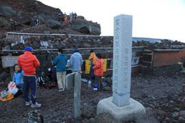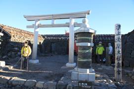 久須志(くすし)神社の鳥居 4時03分 須走口頂上に到着。小屋を出て2時間だった。普通であれば1時間なので、かなりのスローペースだ。頂上の土産物屋さんは大混雑!