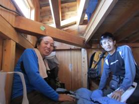 小屋の前で酸素を補給。 4時14分 T師匠は少々気分が悪く、携帯酸素を吸って気分を落ち着かせる。多少の効果はあるようだ。