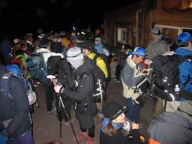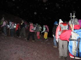 頂上まで大渋滞 2時30分 真っ暗な闇の中、ヘッドライトの明かりが下の方から頂上まで続いている。とにかく、若者たちがたくさん登っていた。日頃、よく見かける私たちのような中高年の登山者は少ない。富士登山は、若者に人気のようだ。 富士登山はレジャー登山なのか? 富士登山の魅力は・・・御来光? 話題性? それとも やはり日本一の標高制覇? |