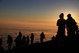 5、お鉢巡り開始 5時23分 御来光を拝むと一斉に人が動き出した。 すぐに下山する人も多い。私たちは計画通り一周3キロのお鉢巡りに挑戦することにした。 朝日がとても強く、眩しい。その光は山頂を赤く染めた。雲海は時間とともに表情を変えていく。色や形がとても面白い。ずっと雲海を見ていると、何故か自分たちが宙に浮いている気分にもなってくる。不思議な世界だ。 |