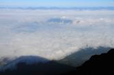 山小屋からふと下を見ると、雲海に映る夕日の影富士が・・・。素晴らしい光景である。