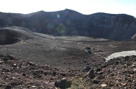 噴火口 7時11分 まだ雪が残っている部分がある。まるで月面のようだ。直径700m深さ250mのすり鉢形。