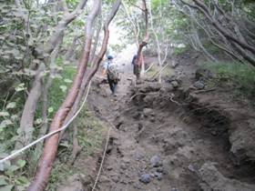 徐々に緑が消えていく 11時50分 登山口を出発して、おおよそ三時間。この辺りが草木の限界地帯か。以後は砂と石の世界。