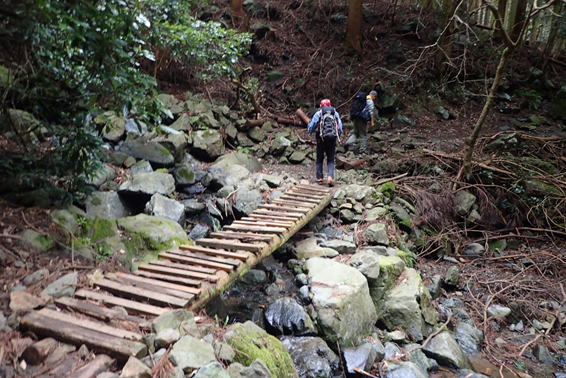 虎尾桜の分岐から木製の橋を使って沢を渡る 7時42分 足下に注意して渡ろう!