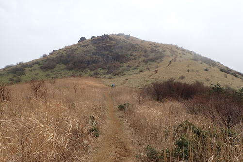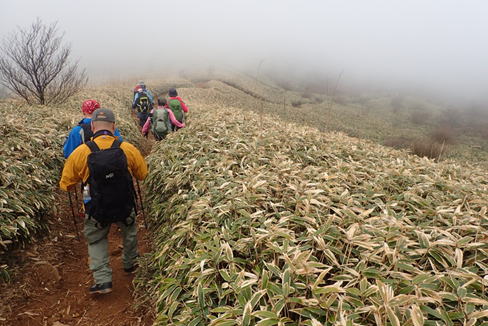 八丁の辻を過ぎた頃、後方から「うぁー」と言う歓声が聞こえてきた。振り向くと霧が晴れて福智山全体が見えるではないか! 何度も見ている風景だが、見えると嬉しいものだ。 |