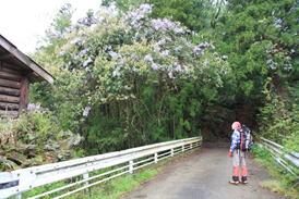 1、頂吉(かぐめよし)登山開始 7時33分 駐車したすぐ後ろの橋から上頂吉林道に入る。 さっそく山藤のアーチが出迎えてくれた。 ここは左手から吉原川、右手からは山の神川が流れ込み、紫川の起点とされている。 紫川起点の碑 |
