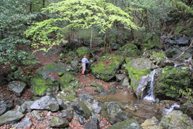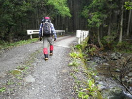 せせらぎロード 14時38分 木漏れ日の中、川の流れる音を聞きながら気分よく下山していく。 軽快に下る |